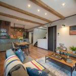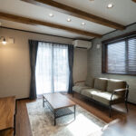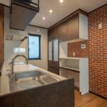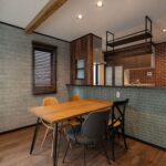 木目の飾り梁やレンガ調のキッチン壁が印象的な、ヴィンテージ感あふれるLDKです。落ち着いたトーンでまとめつつ、素材の存在感がしっかり感じられるアメリカンカジュアルな雰囲気が魅力。リビング・ダイニング・キッチンが一直線に配置されているので、家族の気配をいつも近くに感じながら過ごせます。無骨さとあたたかさが心地よく混ざり合った空間に仕上がっています。