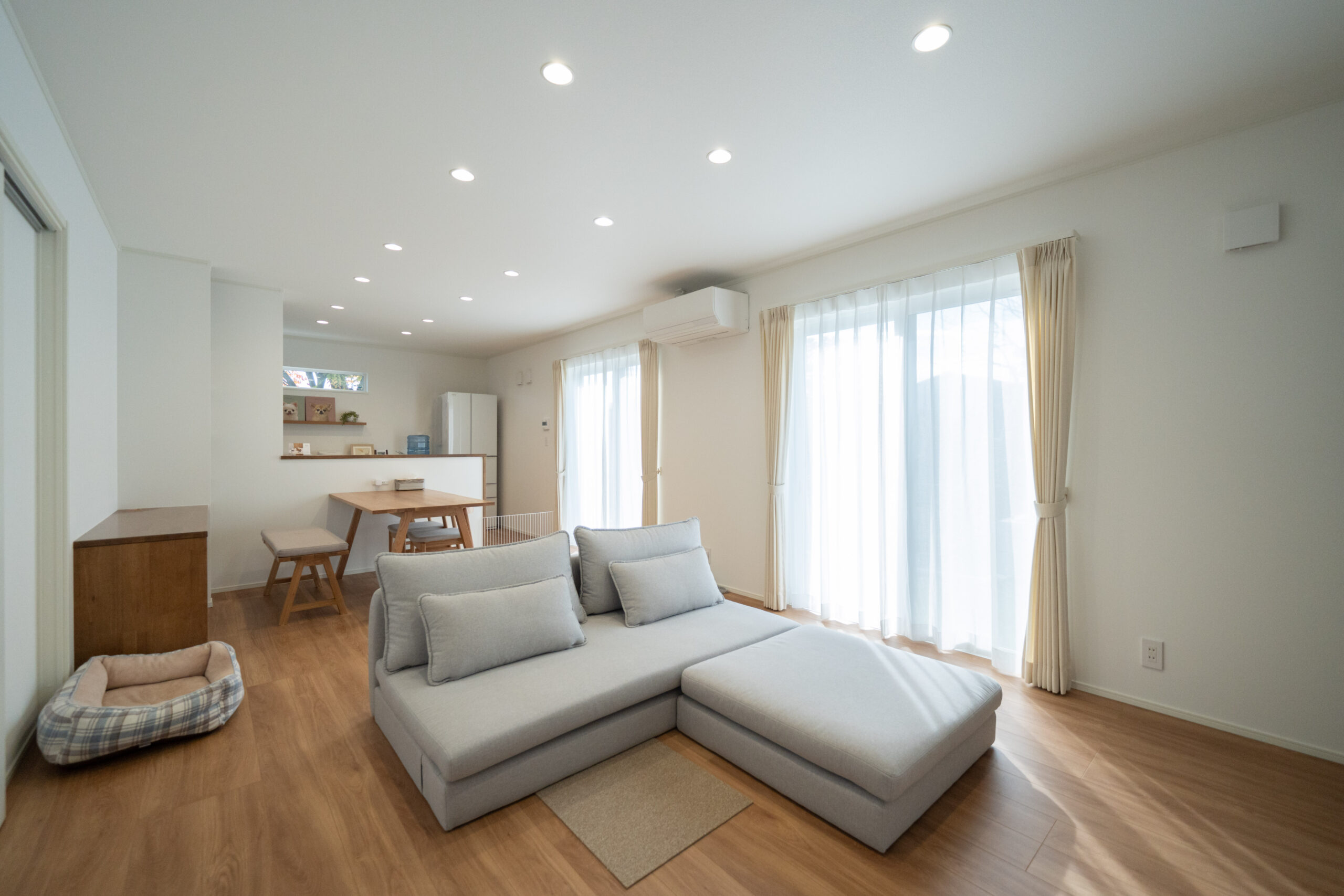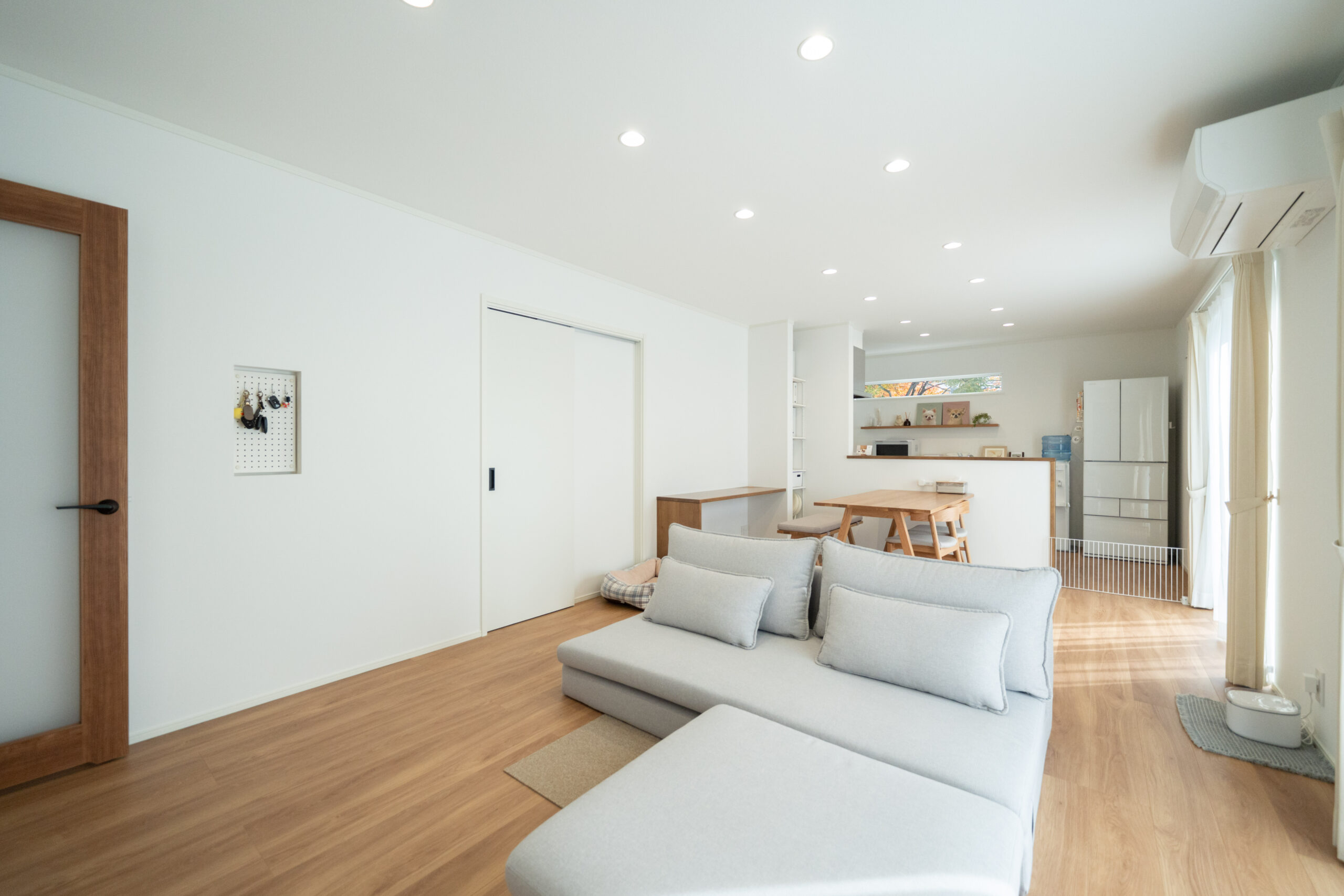 大きな窓から光が差し込むLDKは、直線上に広がる開放的なレイアウトが特徴。白と木目を基調としたナチュラルな空間は、家族が自然とリビングに集まる穏やかな雰囲気です。ダイニング横にはカウンターを設け、ワークスペースとしても活躍。暮らしにちょうどいい機能性が詰まったLDKです。