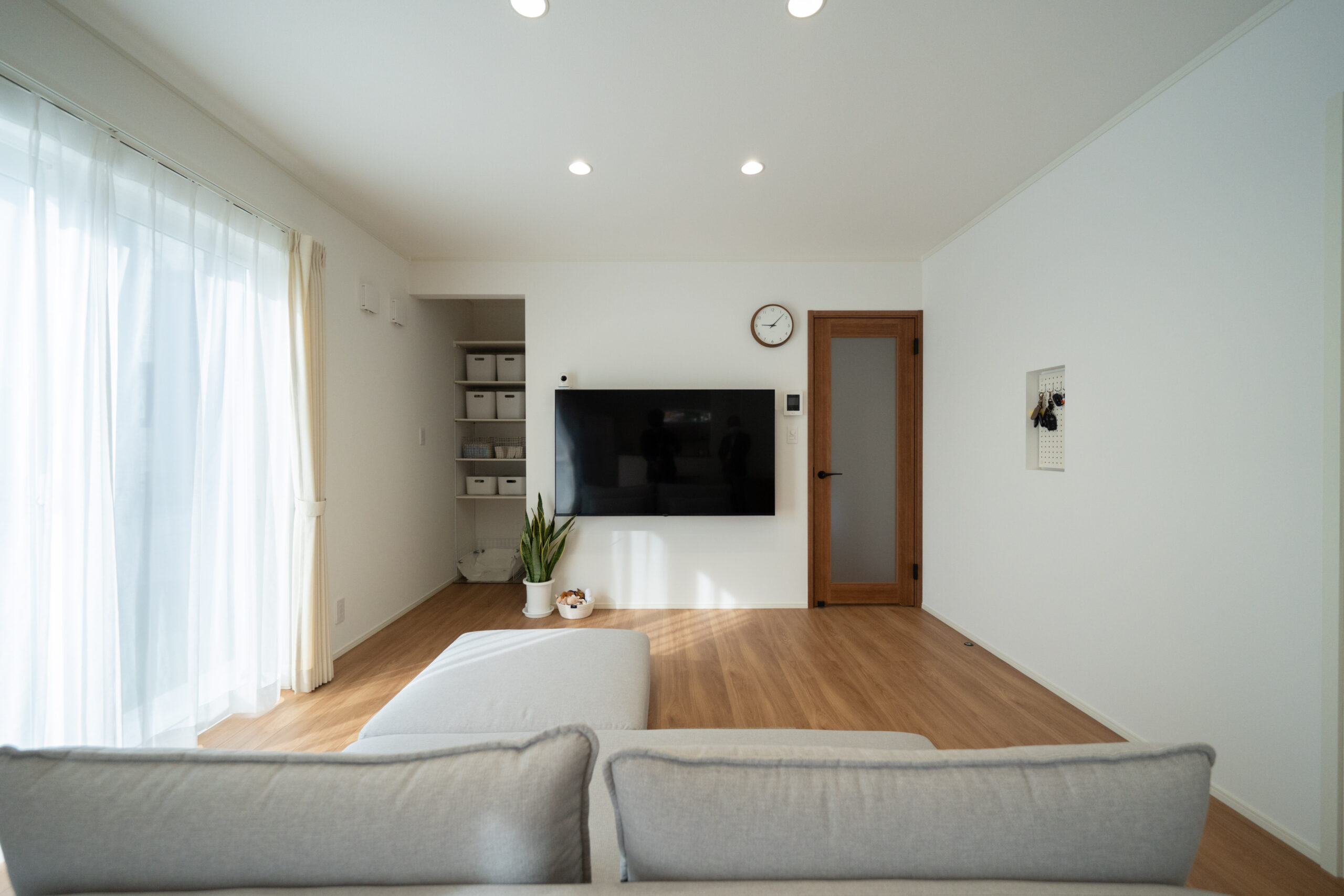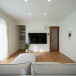 テレビは壁掛けにし、背面には大きな収納スペースを確保。日用品や生活小物はすべてここにまとめることができるため、リビングがいつでもすっきり保てます。見た目も機能面も両立した収納計画で、家族みんなが片付けやすく、快適な空間をキープできます。