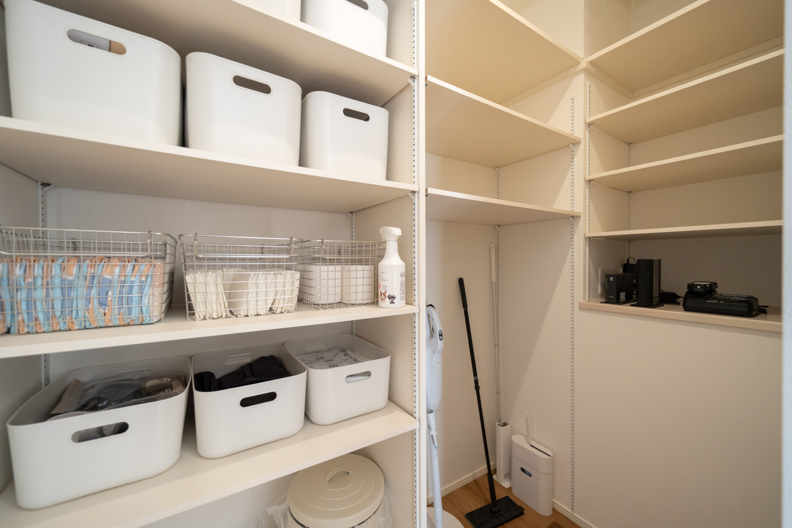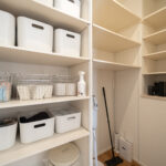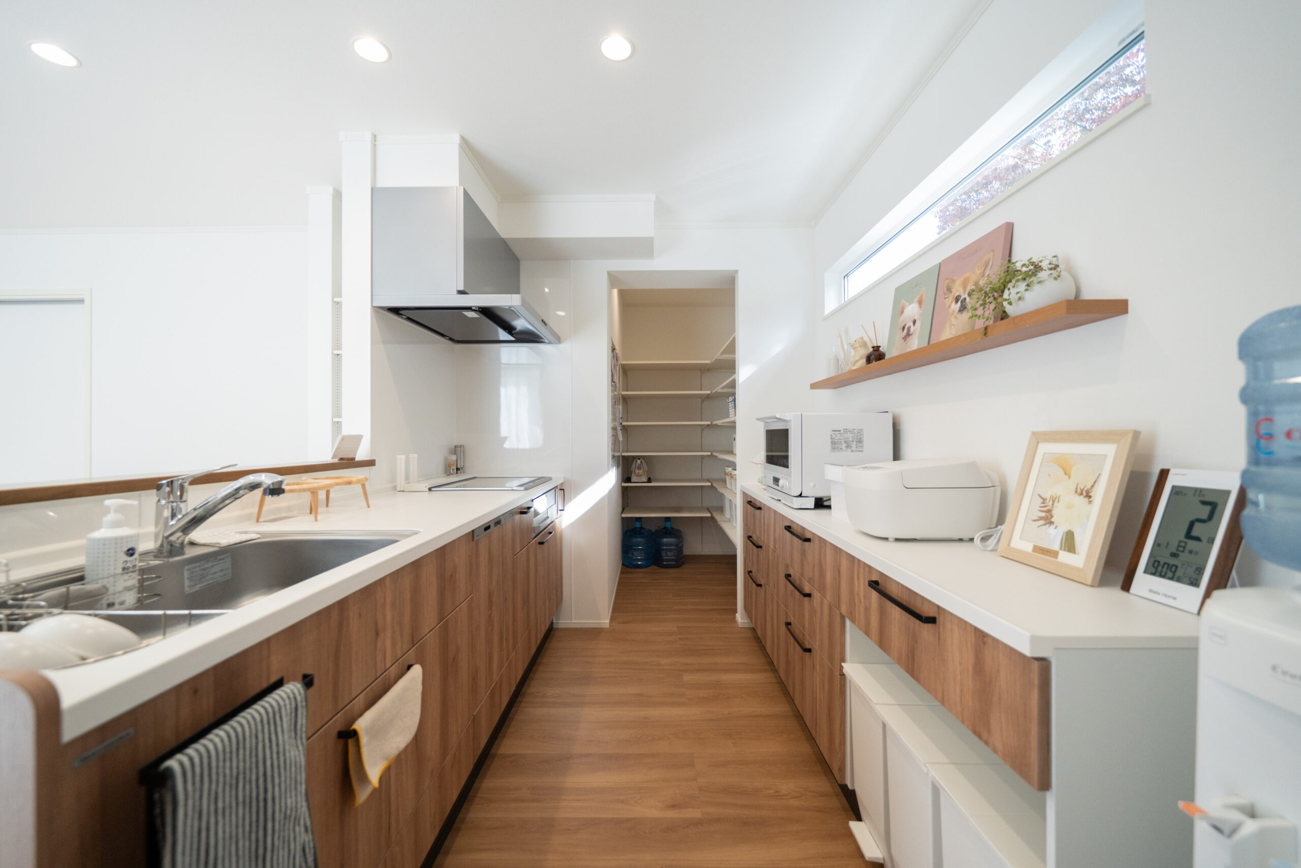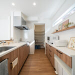 木目を活かしたあたたかみのあるデザインのキッチンは、リビング全体を見渡せる安心の配置。家族とのコミュニケーションが自然と増える間取りです。奥には大容量のパントリーを備えており、食品やキッチン家電もしっかり収納可能。使い勝手の良さとデザイン性を兼ね備えたキッチン空間になっています。