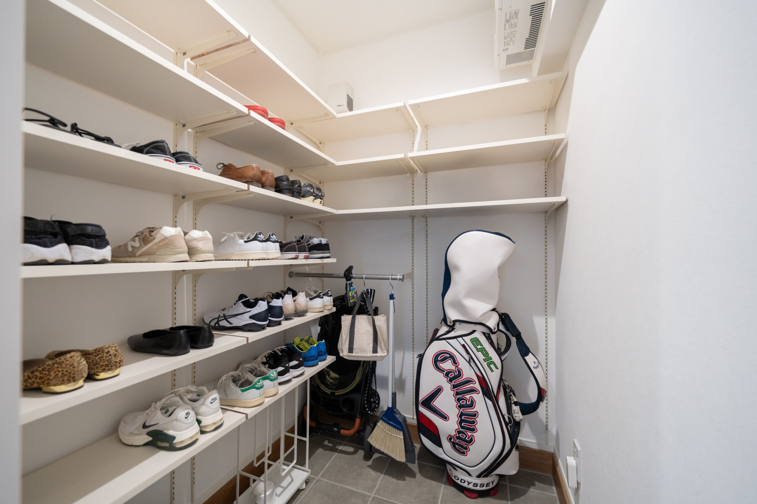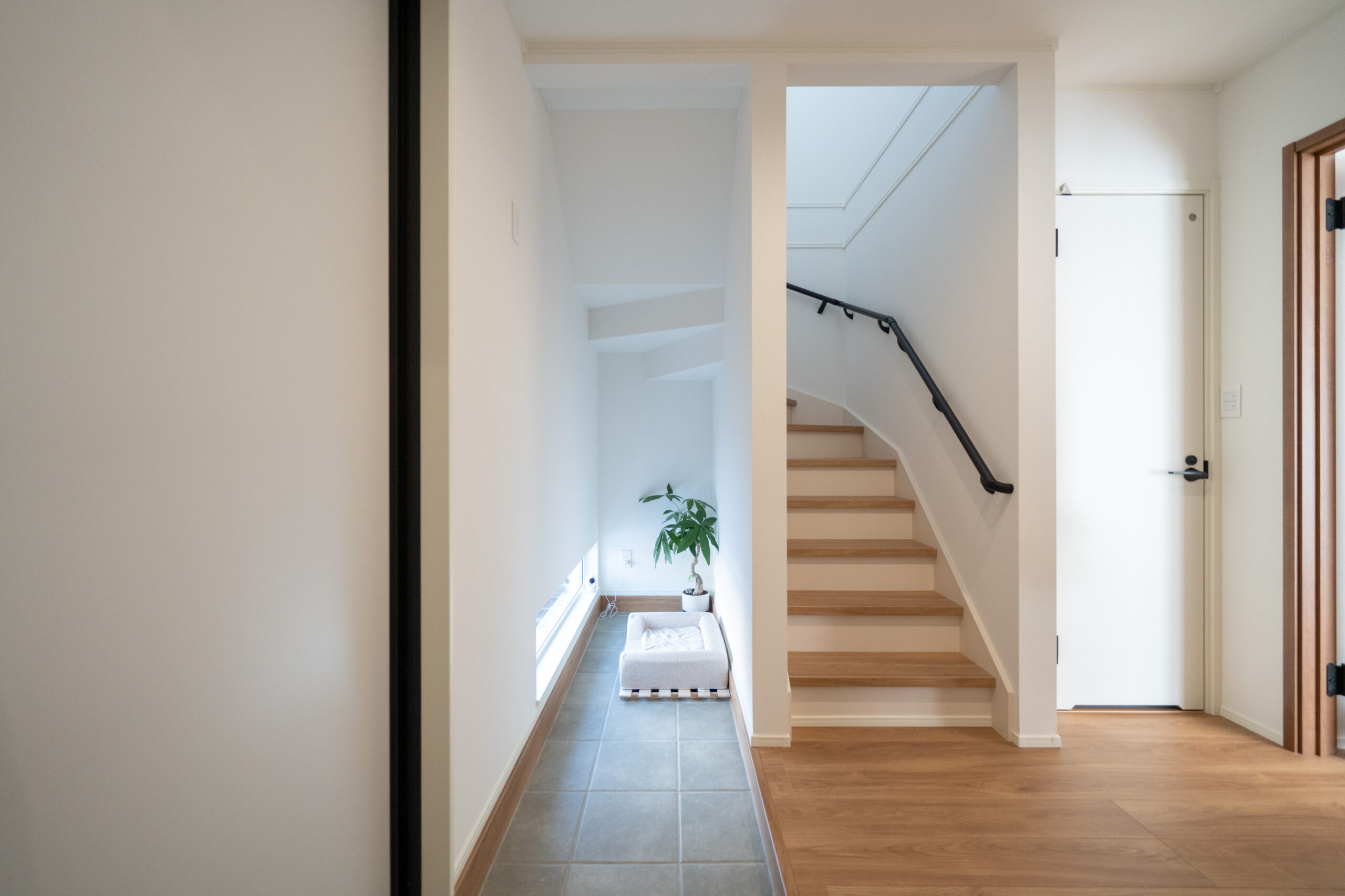 玄関の土間スペースは広めに設計し、わんちゃんの居場所としてもぴったりのつくりに。反対側には大容量の土間収納を設けており、靴やアウトドア用品などもしっかり収納できます。出かける準備や帰宅後の動線がスムーズになり、家族にもペットにもやさしい玄関空間です。