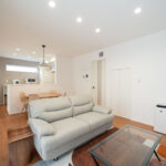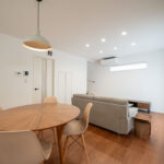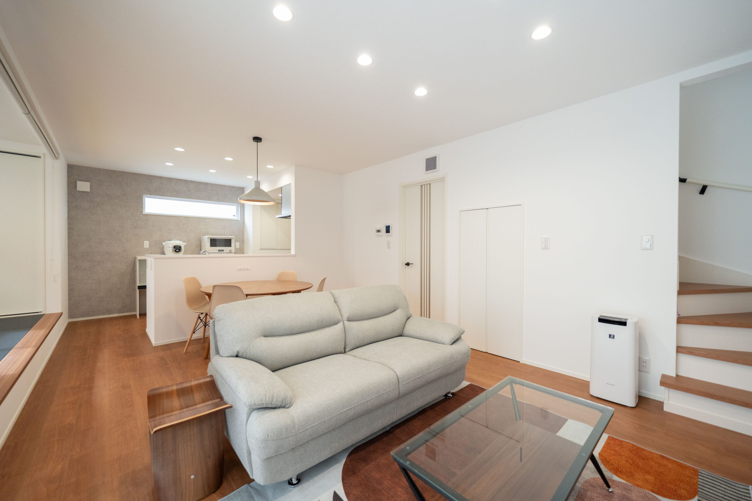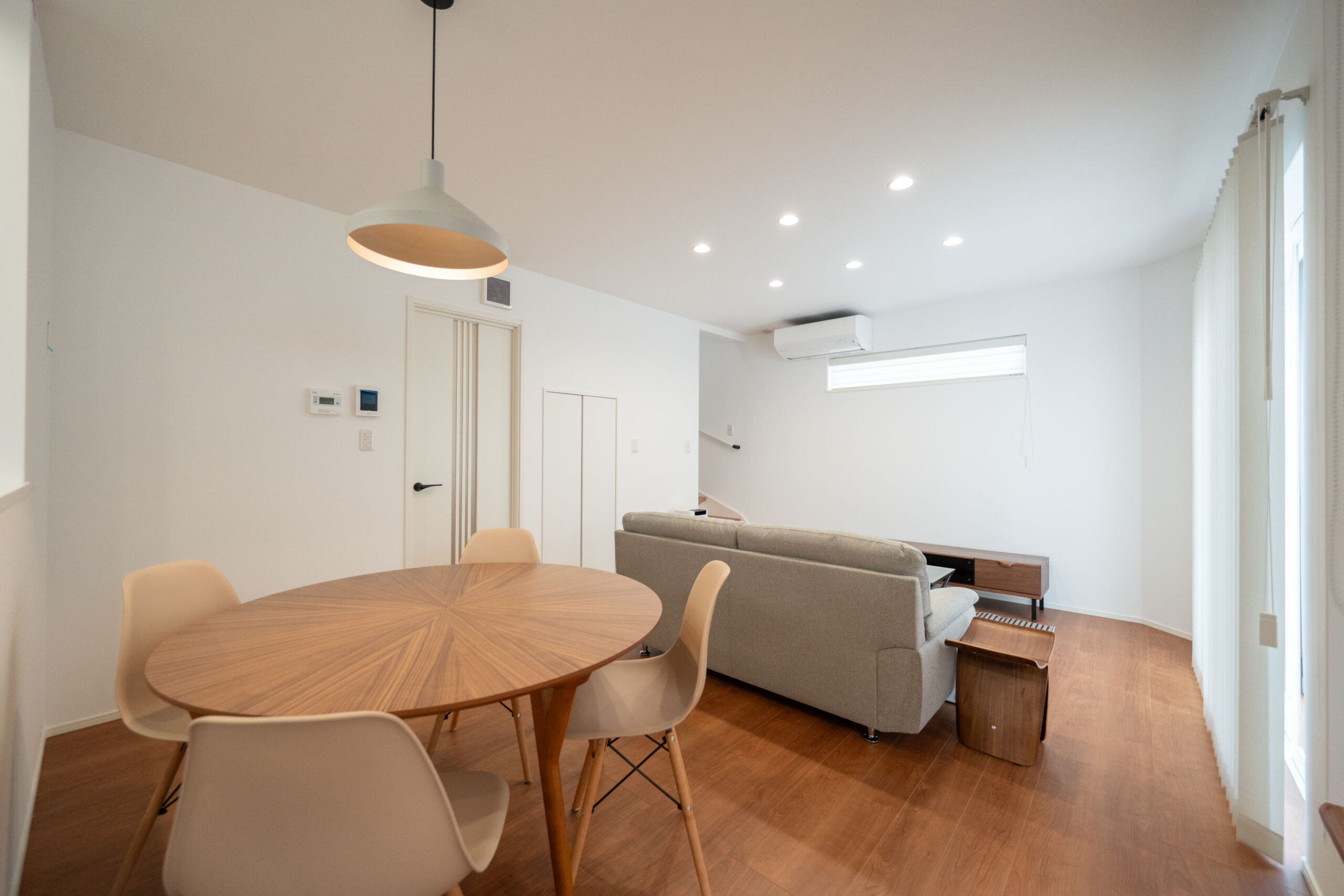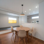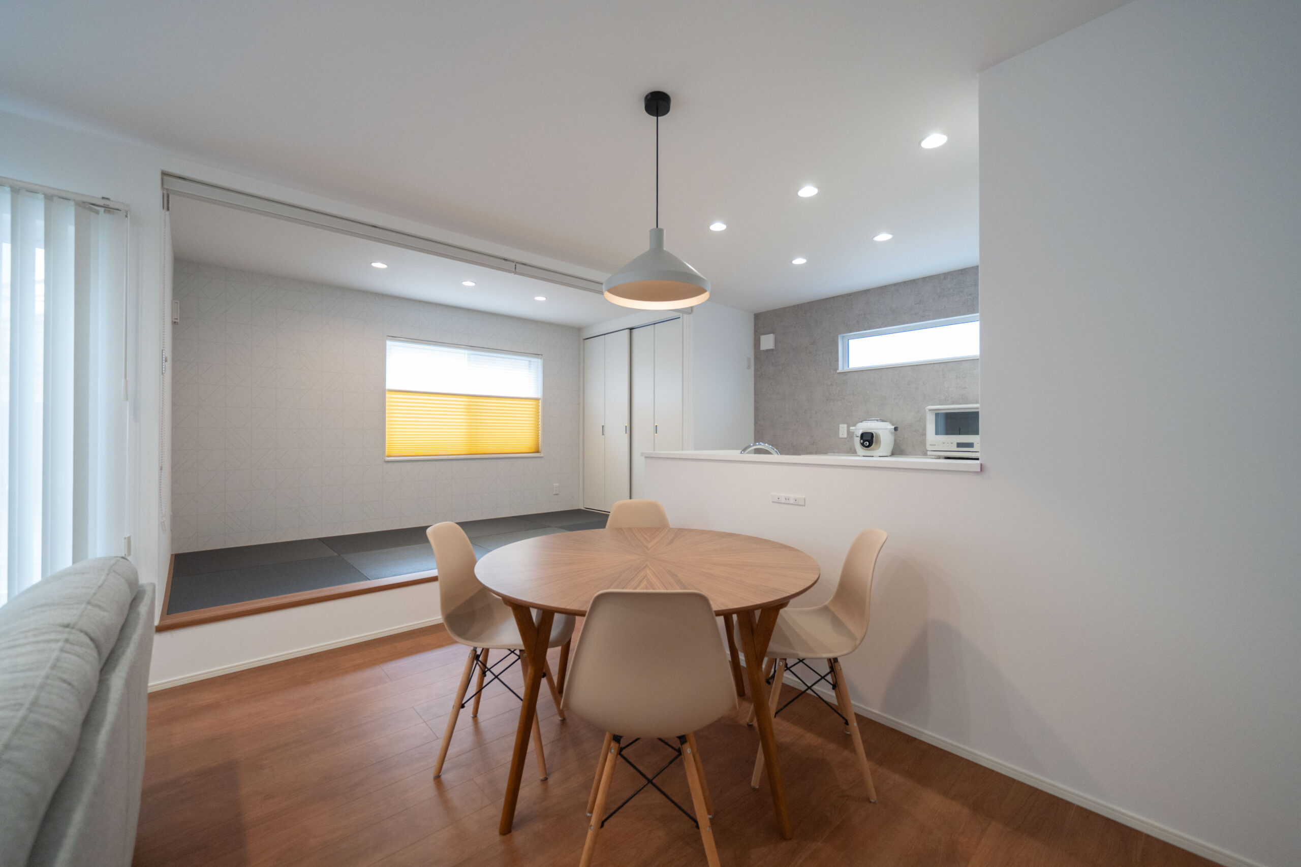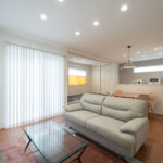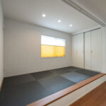 木目と白を中心にまとめた、レトロでモダンなミッドセンチュリースタイルのリビング。ナチュラルな温かさを感じながらも、すっきり整ったシンプルさが心地よい空間をつくっています。リビング横には小上がりの畳スペースを設け、くつろぎの場としてはもちろん、子どもの遊び場や来客時の簡易的な客間としても活躍。フラットでは得られない“こもり感”があり、家族が自然と集まる場所になります。