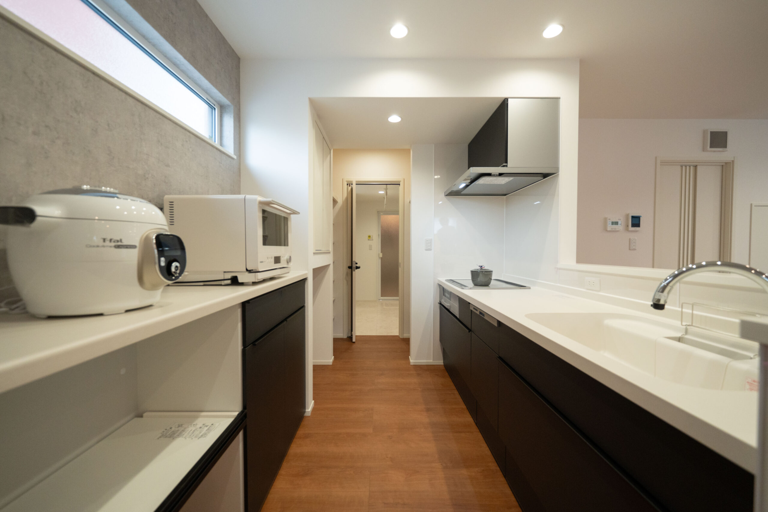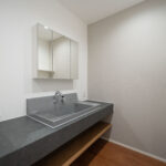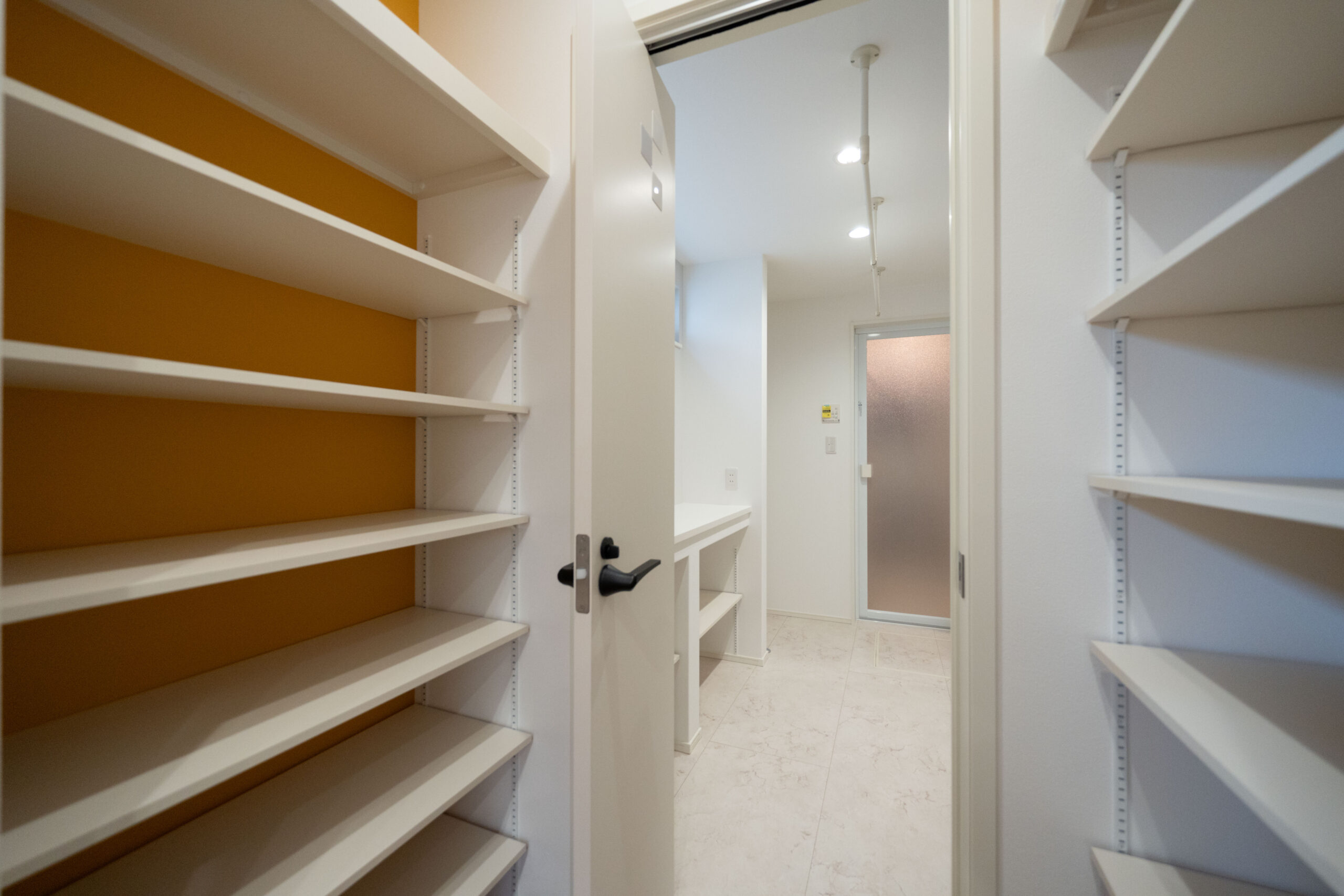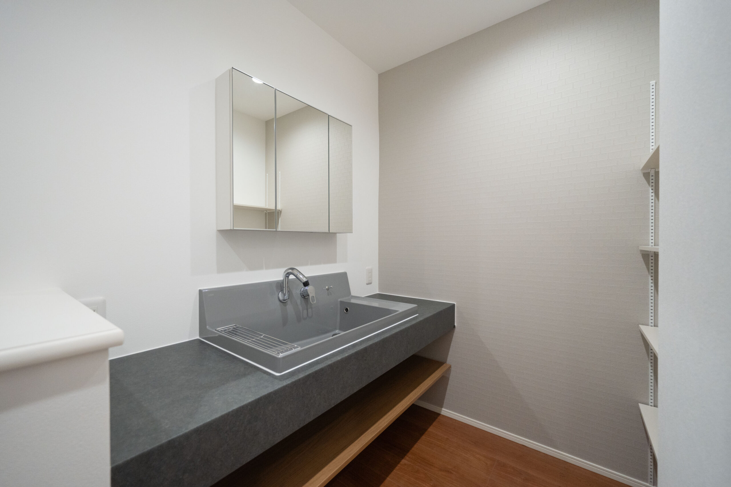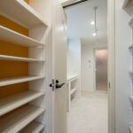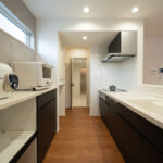 リビング全体を見渡せるレイアウトで、家族とのコミュニケーションが取りやすいキッチン。背面には大容量のパントリーを配置しており、食品や日用品をまとめて収納できるため生活感が出にくく、すっきりとした空間を保てます。また、キッチンの隣にはランドリールームを直結させ、料理の合間に洗濯作業ができる家事ラク動線を実現。毎日の家事効率をぐっと高めてくれます。