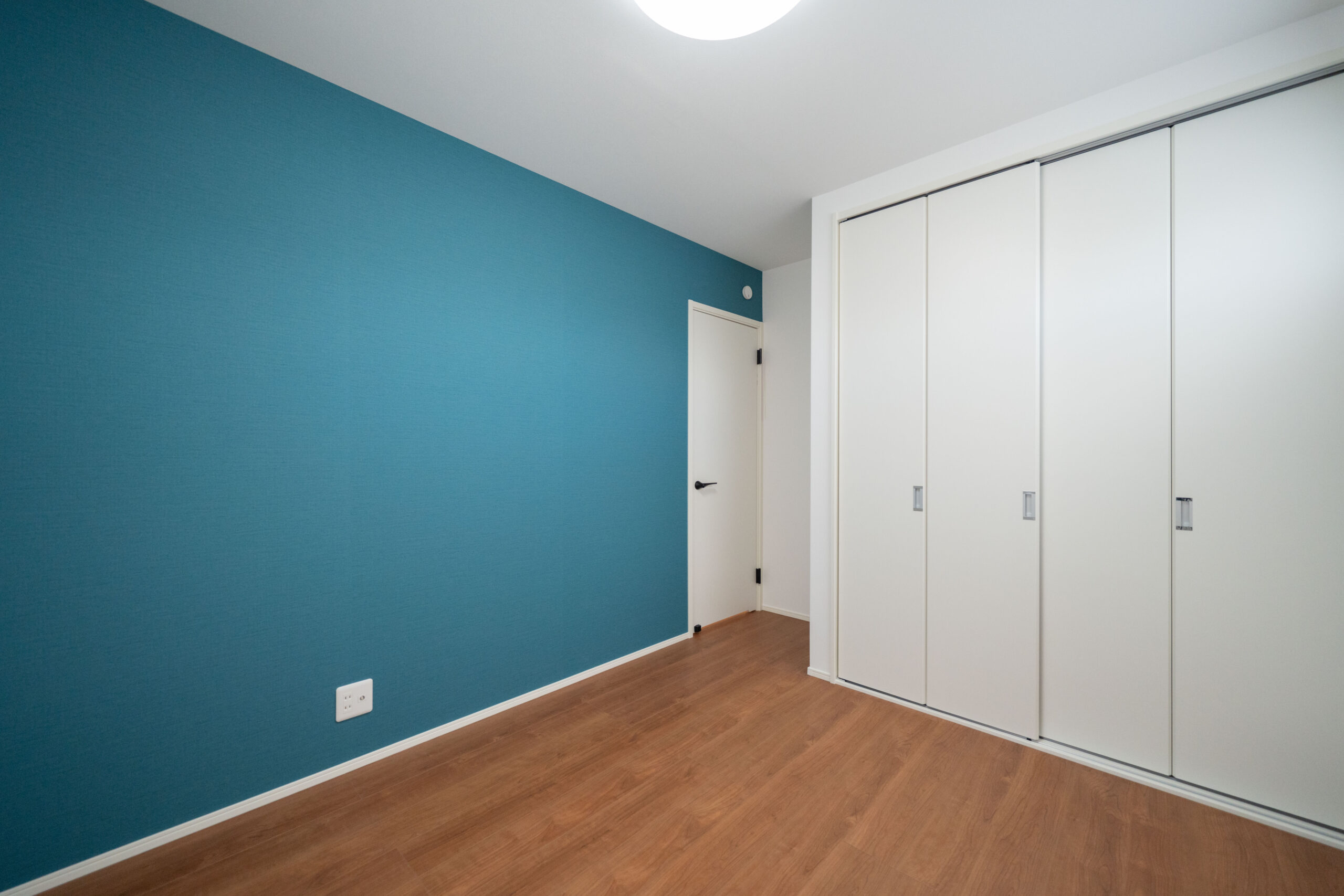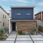 木目とブルーのラップサイディングを組み合わせた、ミッドセンチュリーらしい存在感のある外観デザインです。外壁には東レのラップサイディングを採用し、水平ラインが生み出す落ち着いた佇まいが魅力。異素材の組み合わせがモダンで洗練された印象をつくり、個性的でありながら街並みに馴染むデザインに仕上がっています。
