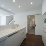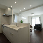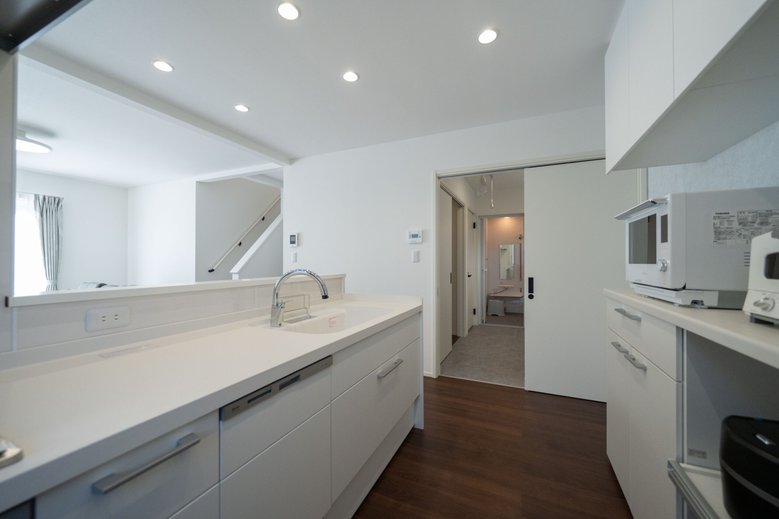 リビング全体を見渡せるオープンな配置で、家族とのコミュニケーションが取りやすいキッチン。料理をしながらお子さまの様子を見守れる、安心感のあるレイアウトです。すぐ隣にはランドリールームを配置しており、「洗う・乾かす・しまう」の動作を短い距離で完結できる家事ラク動線を実現しています。