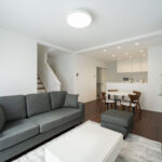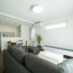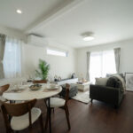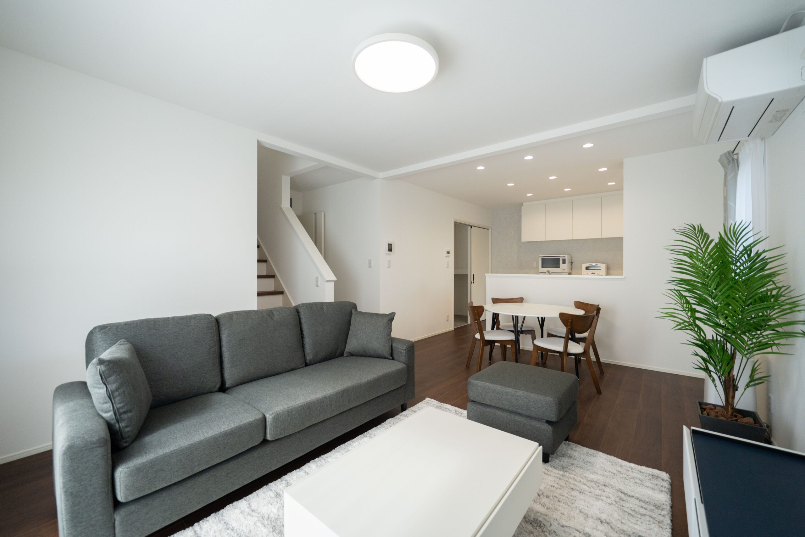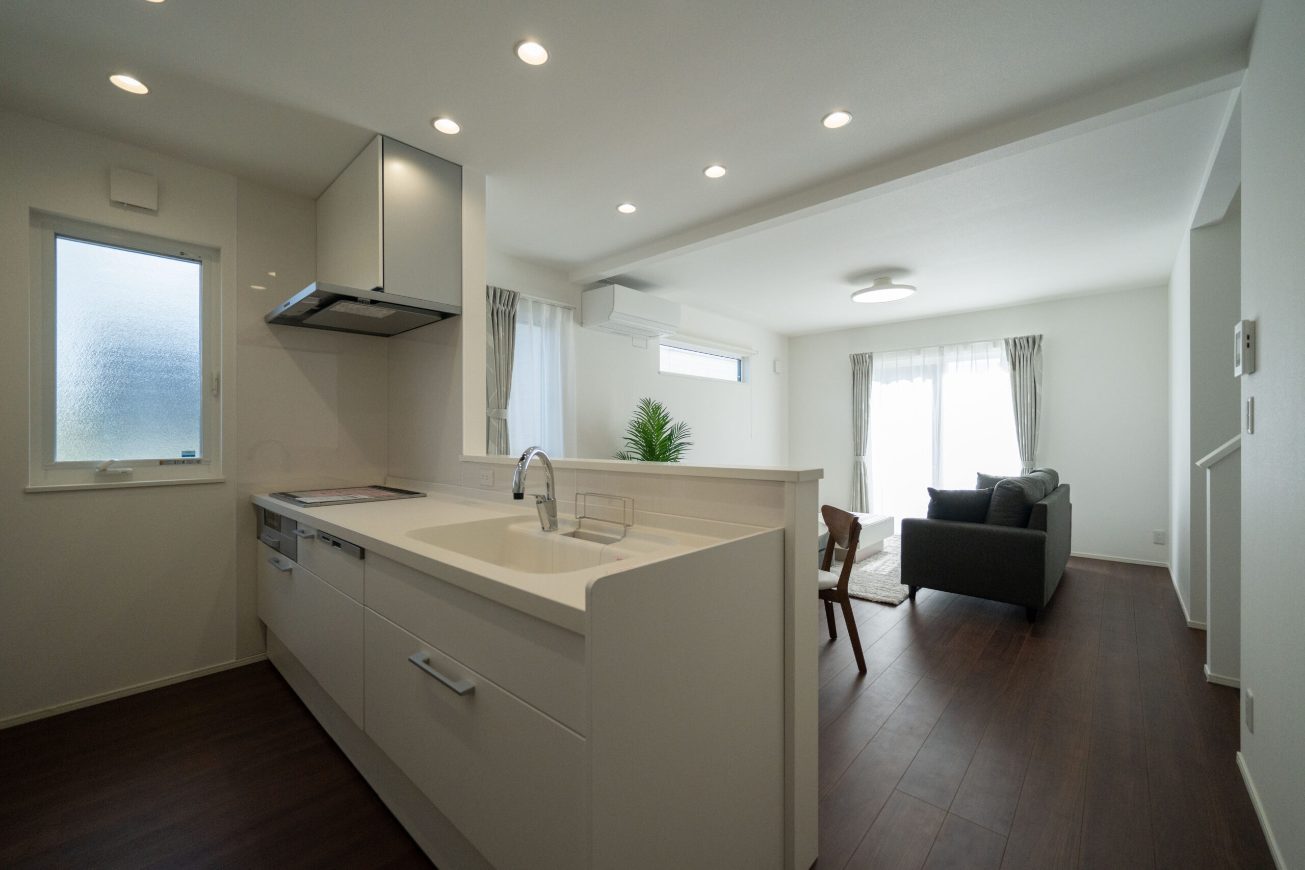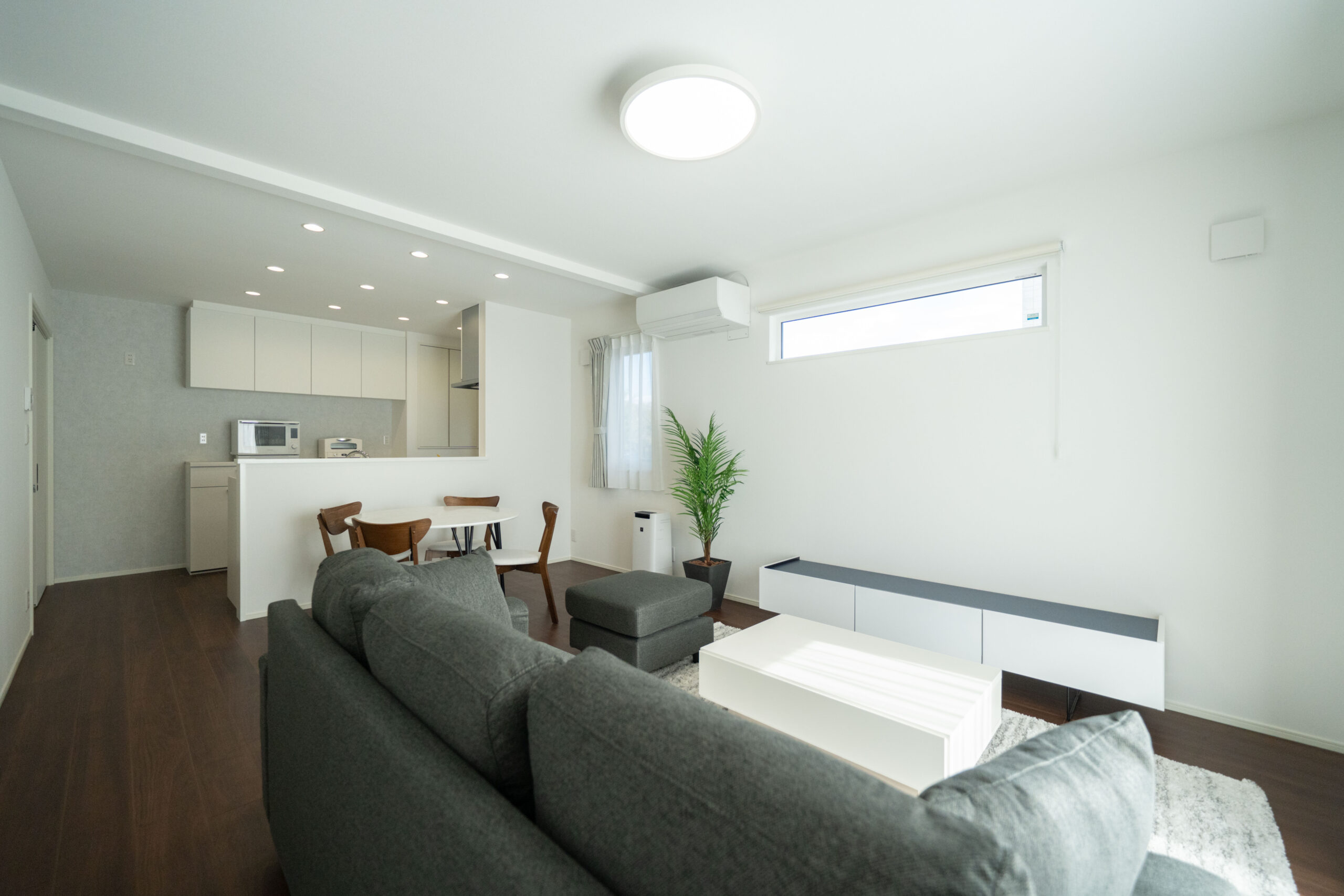 ウォールナット色のフローリングにホワイトの内装を合わせた、落ち着きのあるシンプルモダン空間。家具や小物の色が選びやすく、暮らしのスタイルに自然と馴染むコーディネートが特徴です。リビング・ダイニング・キッチンが直線上に配置されているため、家族の気配を感じやすく、自然と会話が生まれる間取りになっています。