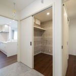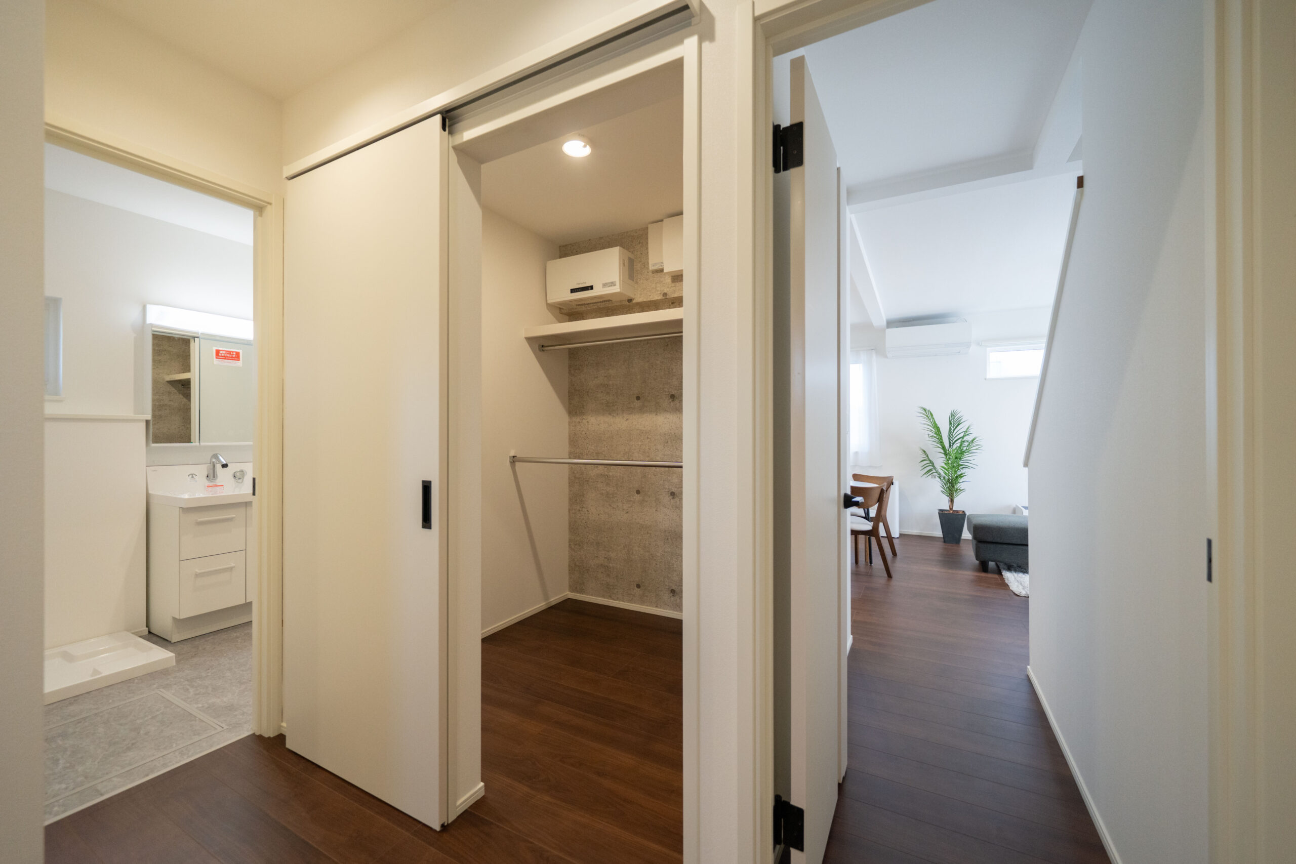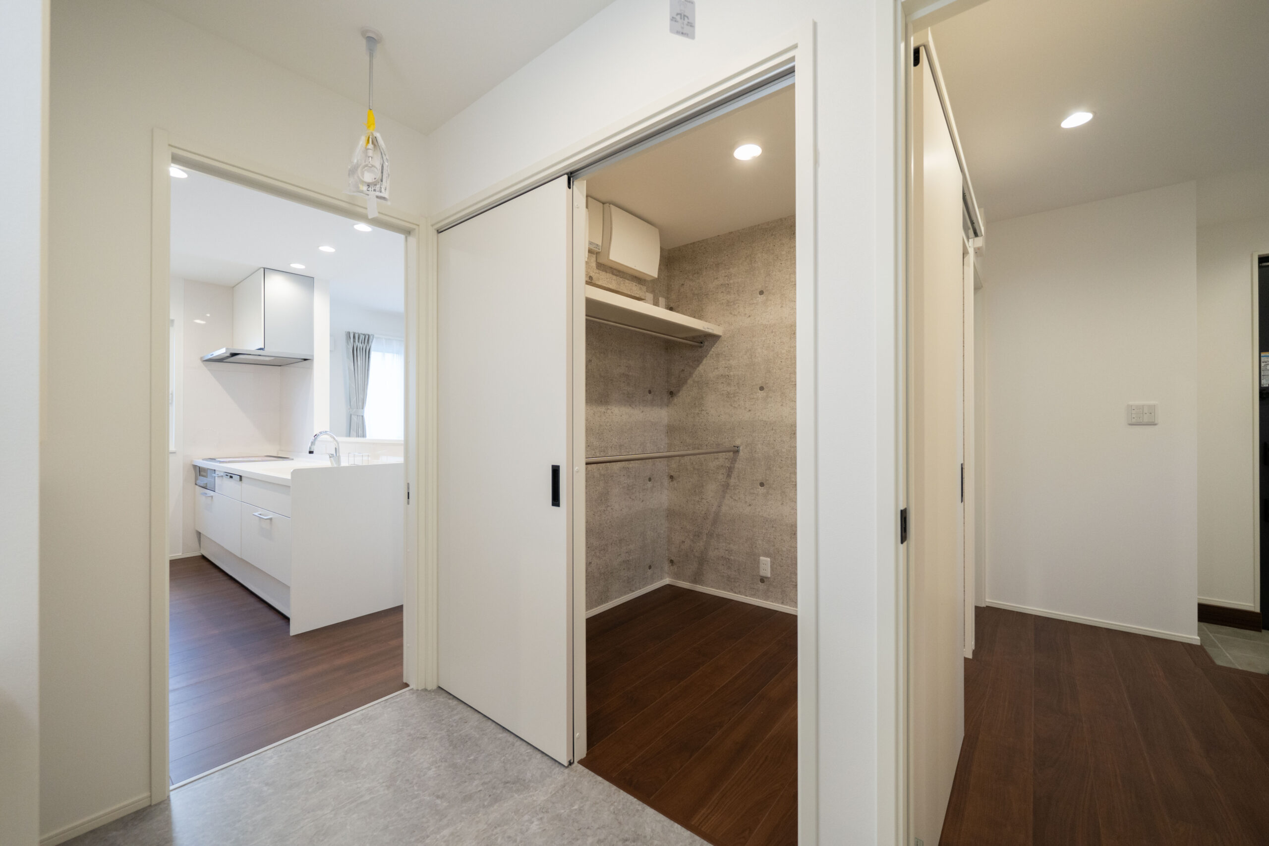 ランドリールームと玄関をつなぐ位置にファミリークローゼットを配置し、帰宅後も家事の動線もスムーズに整う工夫が詰まった設計。ランドリールームで洗って干した衣類は、そのまま数歩でクローゼットへ収納できるため、家事負担を大幅に軽減できます。また、玄関からすぐアウターを脱いで片付けられるため、室内を散らかさず生活導線が整いやすいのも魅力です。