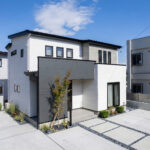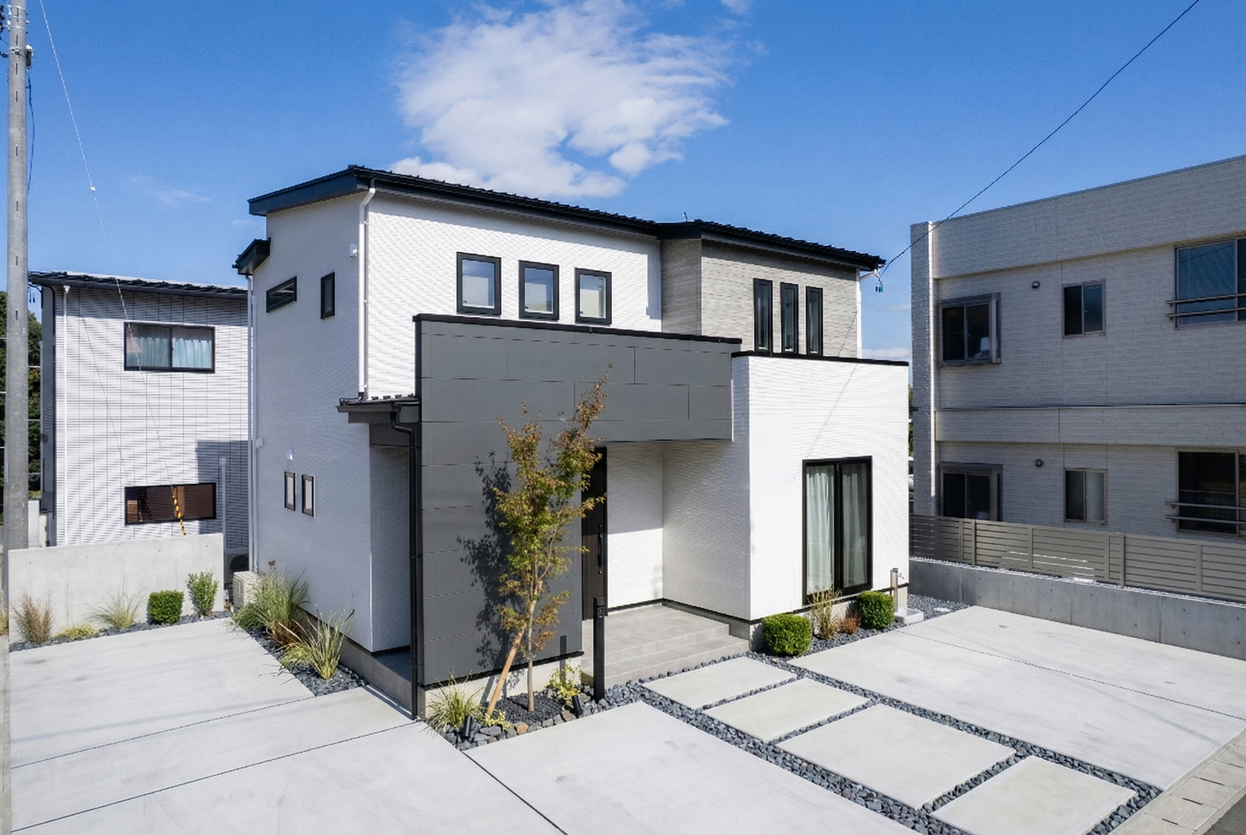 モノトーンをベースにまとめた、シンプルモダンな外観デザイン。白とグレーのコントラストが洗練された印象を生み、飽きのこない美しさを保ちます。アクセント部分にはニチハの「イルミオ」を採用し、よりスタイリッシュで立体的な表情をプラス。直線的なフォルムと素材感のバランスが、シンプルながら存在感のある佇まいを演出しています。