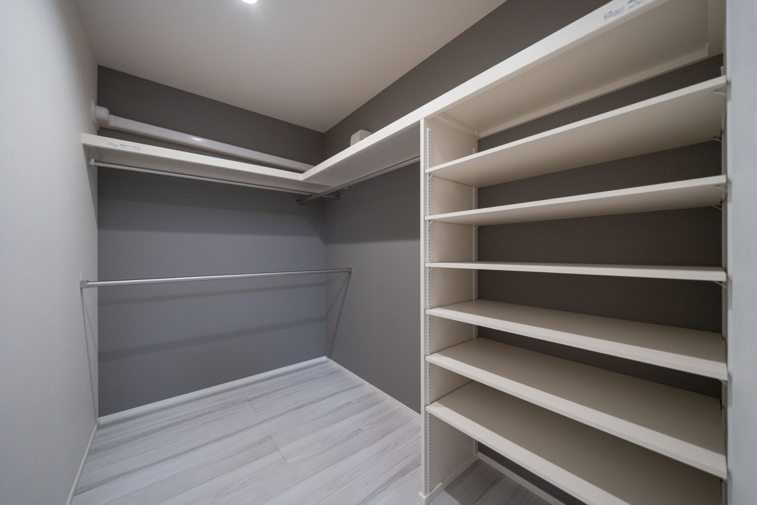 玄関からリビングとキッチンのどちらにも行ける、便利な2WAY動線を採用。買い物帰りはそのままキッチンへ直行でき、荷物をすぐに収納できるのでとてもラク。キッチン奥には大容量のパントリーも配置しており、ストック品や日用品をまとめて管理できる使い勝手の良さが魅力です。家族みんなの“動きやすさ”を考えた間取りです。