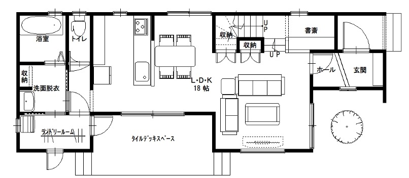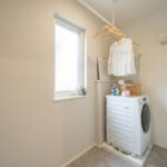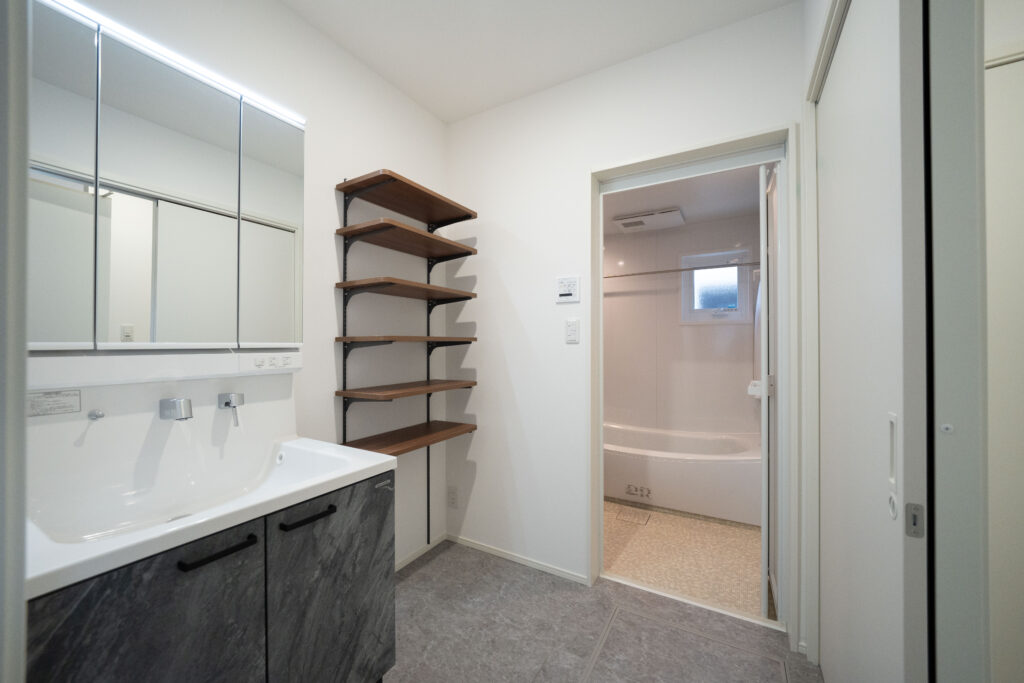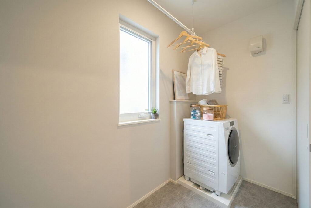 洗面脱衣室とは独立したランドリールーム。「洗う → 干す」が同じ場所で完結するから、洗濯籠に移して運ぶ手間がなく、家事効率がぐっとアップします。また、入浴中でも気兼ねなく洗濯できる快適さが魅力。ランドリールームからタイルデッキへ直接出られるため、シーツなどの大きなものはそのまま外にサッと干せる利便性もポイントです。