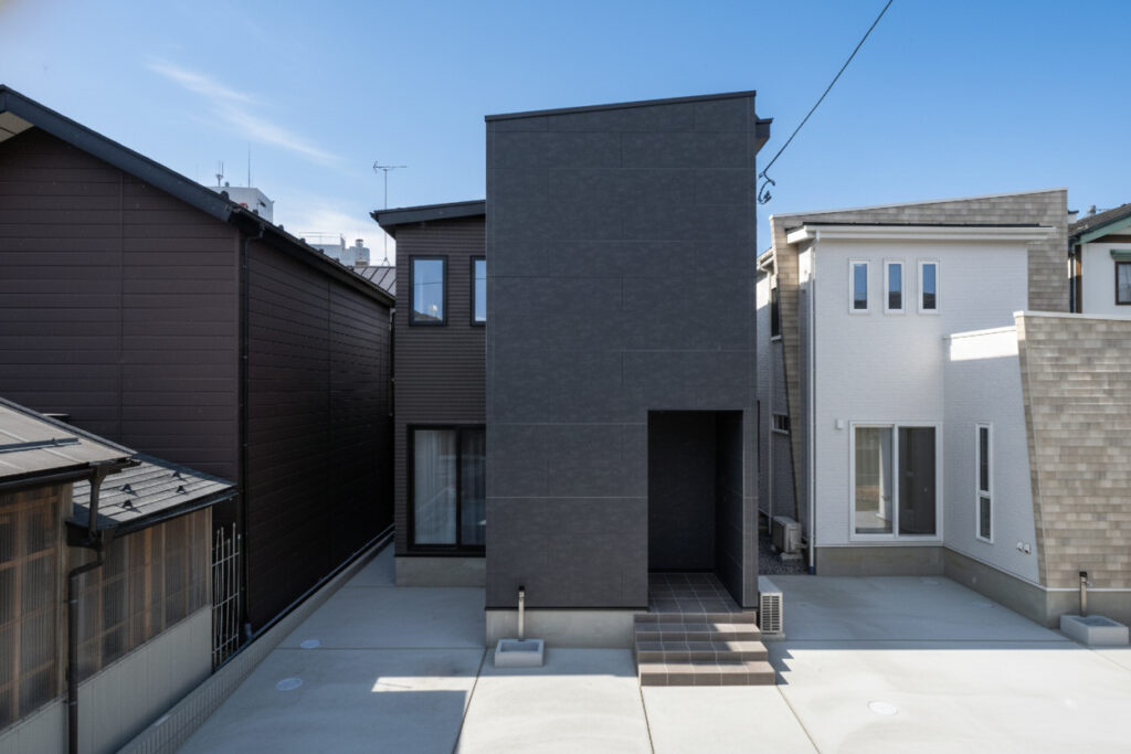 奥行きを感じさせる立体的なフォルムと、重厚感のある色味が印象的な外観デザイン。正面には開口部を少なく配置し、よりモダンで洗練された佇まいに。外壁材には〈ニチハ/イルミオ〉を採用し、素材の質感が引き立つ上質な印象に仕上がっています。
