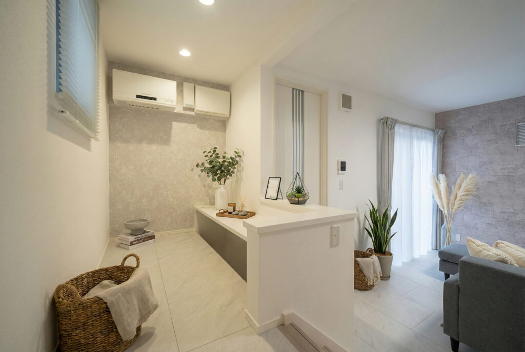 無駄をそぎ落とした洗練されたシンプルモダンの家。白とグレーで統一されたLDKは、家族が自然と集まり会話が生まれる心地よい空間に。キッチンからはリビング全体を見渡せ、明るさと開放感の中で家事ができます。独立したランドリールームやスキップフロアなど、暮らしやすさとデザインを両立した住まいです。