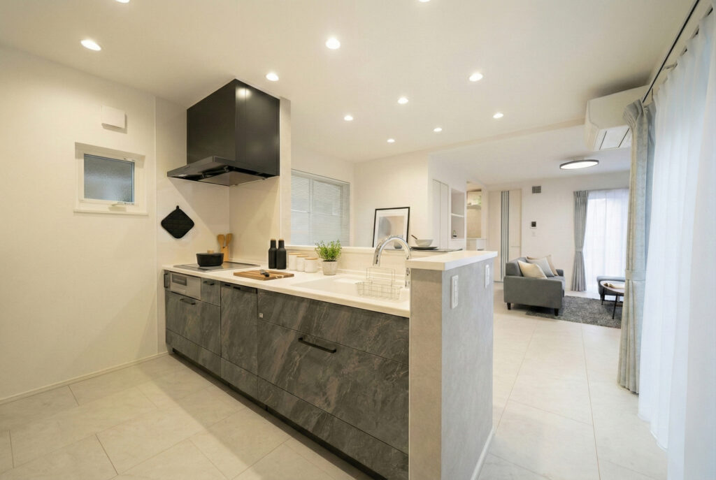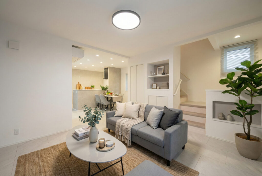 白とグレーを基調としたシンプルモダンのLDK。無駄をそぎ落としたスマートなデザインでありながら、家族が自然と集まり、どこにいてもコミュニケーションが取りやすい間取りに仕上がっています。見た目はスタイリッシュでも、“家族との時間を一番に考えた暮らし方” が叶う、心地よいリビング空間です。