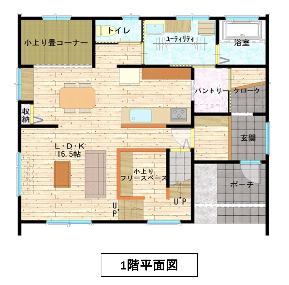 キッチンと横並びに配置されたダイニングは、配膳や片付けがスムーズに行える効率的なレイアウト。リビング横の小上がりの畳スペースは、子どもの遊び場としても活躍し、料理をしながらでも自然と目が届く安心感があります。さらにダイニング横にはカウンターを設けており、勉強や作業スペースとしても活用可能。
