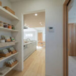 玄関からリビングへ向かう動線とは別に、土間収納からパントリーを通りキッチンへとつながる“帰宅動線”を確保。買い物帰りにはそのまま荷物をキッチンへ運べるため、無駄な移動がなく家事効率を高めてくれます。土間収納にはアウトドア用品やベビーカーなども収納でき、パントリーでは食品や日用品をすっきり管理可能。