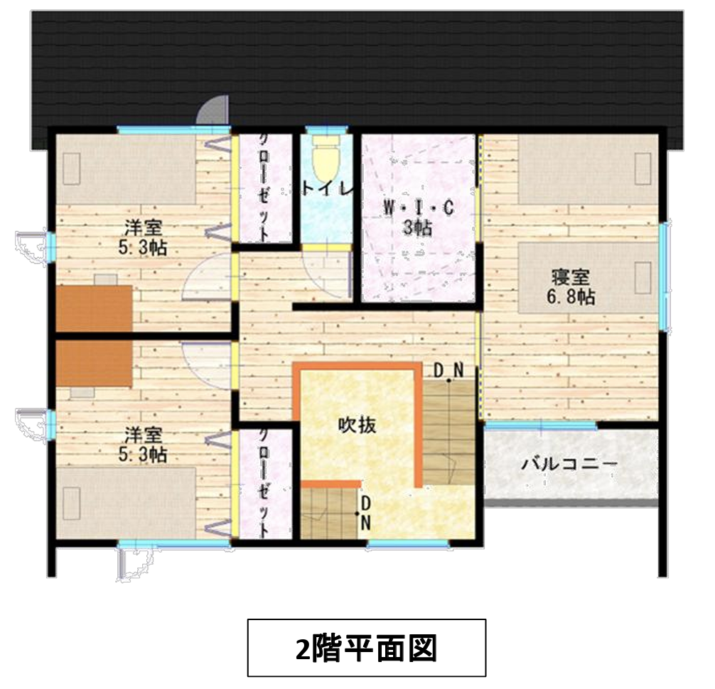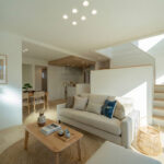 ジャパンディテイストでまとめられたLDKは、木のぬくもりと落ち着いた色合いが心地よい空間。シンプルでありながら、素材感を活かした上質な雰囲気が広がります。階段途中に設けたスキップフロアと吹き抜けが空間に立体感と抜け感を生み、実際以上の広がりを感じられる設計に。